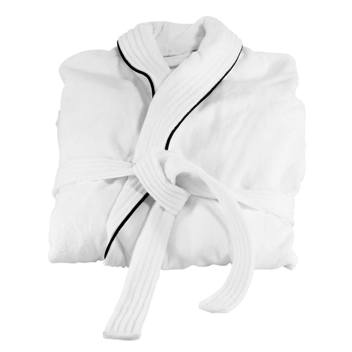 Bademantel aus attraktivem Polyestervelour außen und mit Baumwoll-Walk-Frottee auf der Innenseite.